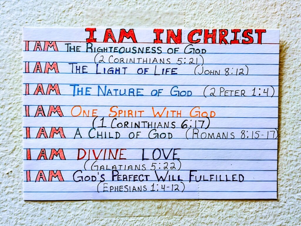 This is a picture of an “I am” list I made to remind me of my identity IN Christ. Please copy and paste the URL below to an address bar to see the picture. Have a Great day IN Jesus!